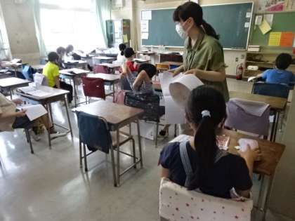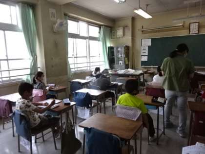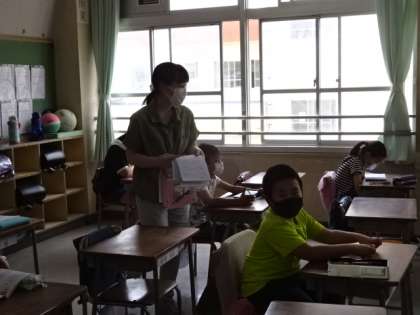 担任の先生が子供たちのそばまで歩きます。感染拡大防止です。