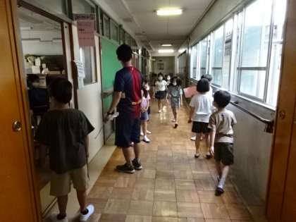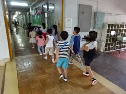 1・2年生の子供たちが校舎内を歩きます。