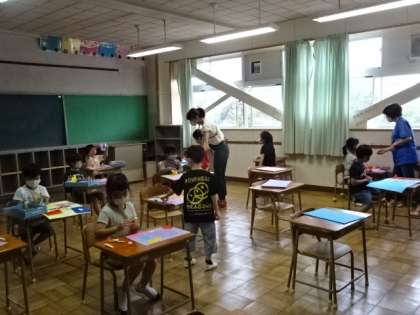 音楽ではマスクをしながら歌を歌う場面もあります。「3密」にならない工夫です。