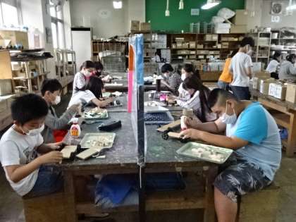 向かい合う子供たちの前には「ビニールの透明シート」を設置しています。