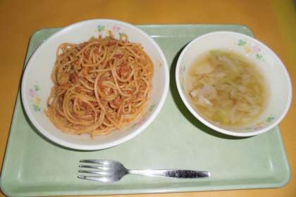 ☆今日の献立 スパゲティミートソース キャベツスープ 牛乳