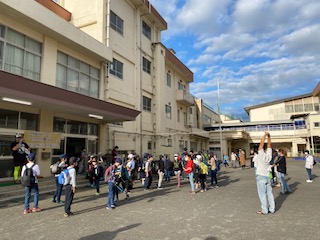 午前7時15分、5年生の子供たちが、中庭に集まり出しました。