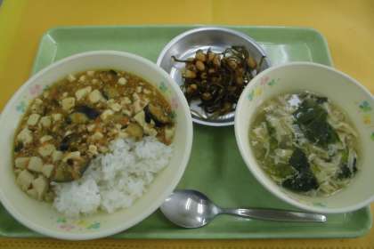 ☆今日の献立 ごはん マーボーなす レタスとたまごのスープ ぶどう豆 牛乳