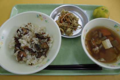 ☆今日の献立 さんまのひつまぶし風ごはん けんちん汁 野菜のごまおかか和え みかん 牛乳
