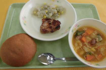 ☆今日の献立 照り焼きサンド 野菜と豆のカレースープ煮 コーンポテト 牛乳