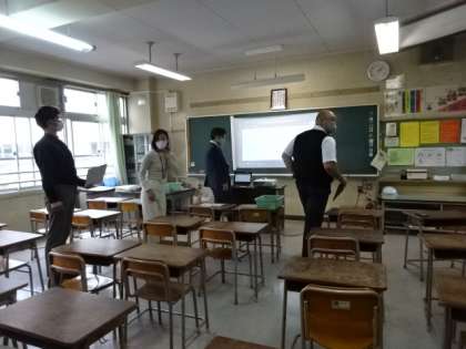 隣の教室には、スクリーンに授業の様子を映し出していました。
