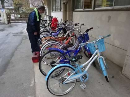 今日の「自転車安全教室」で使う自転車を点検しているのです。