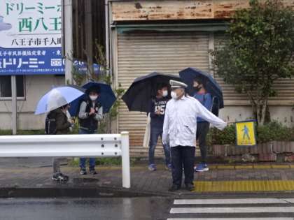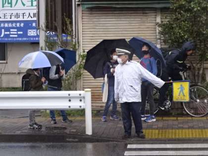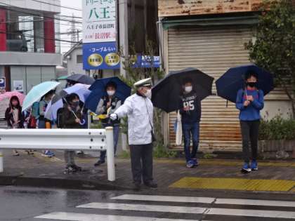 交通安全協会の方々が子供たちの登校を見守ってくださっています。