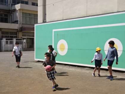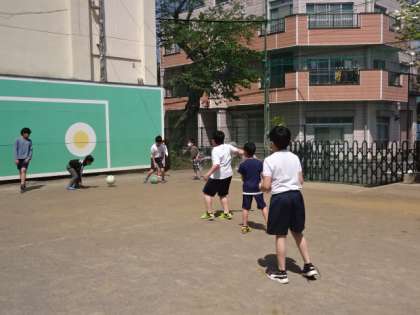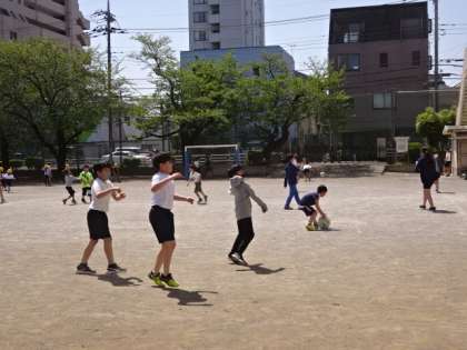 的当て(通称:目玉焼き)の前では、様々な学年が一緒にボール投げをしています。いいですね。異学年交流です!