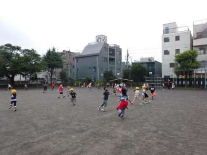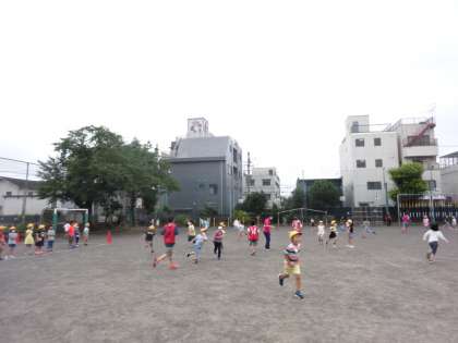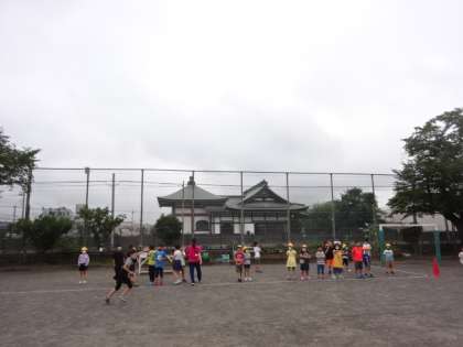 集会「タッチされた人は、朝礼台の前にある赤いコーンの所に来てください。」