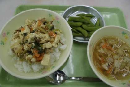☆今日の献立 ごはん 四川豆腐 くずきりスープ 枝豆 牛乳
