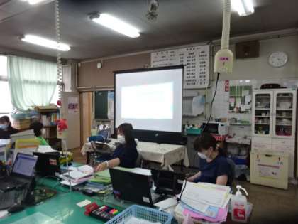 教職員が映像を見ています。