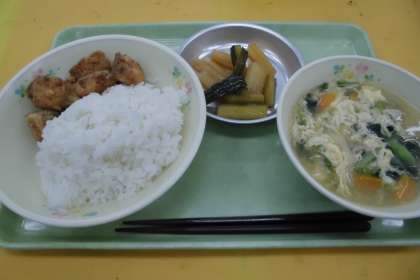 ☆今日の献立 ごはん 真鯛の香り揚げ かきたまじる キュウリと大根の南蛮漬け 牛乳