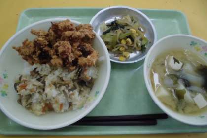 ☆今日の献立 きのこごはん いかのカリンと揚げ みそ汁 野菜のおかか和え 牛乳