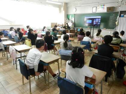 ○ 放課後の教室。担任の先生や専科担当の先生方が机やいす等を消毒。