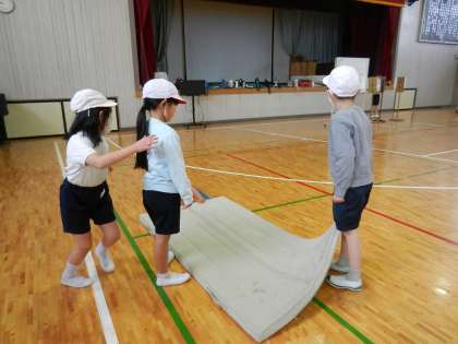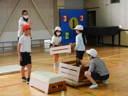 様々な遊び方を通して、跳び箱を跳ぶために必要な動きを身に付けるようにすることがこの時間のねらいです。