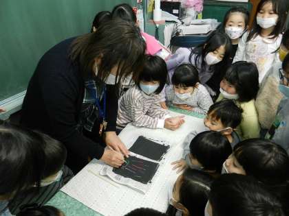 ひっかくことで出来た色や形を楽しむことがねらいです。