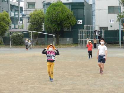 黄色い帽子をかぶった1年生が「校庭デビュー」をしました。