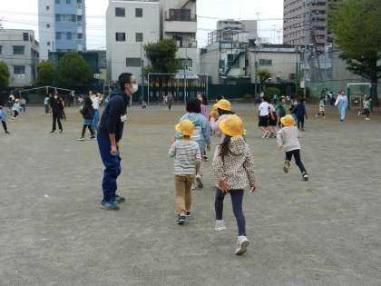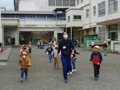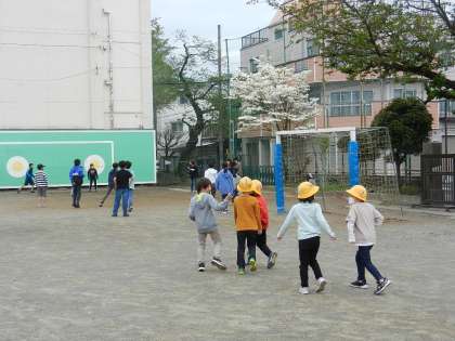 2つのクラスの子供たちが校庭に出ます。