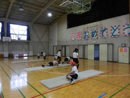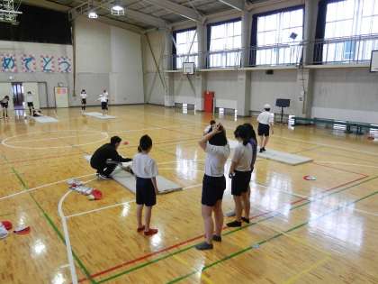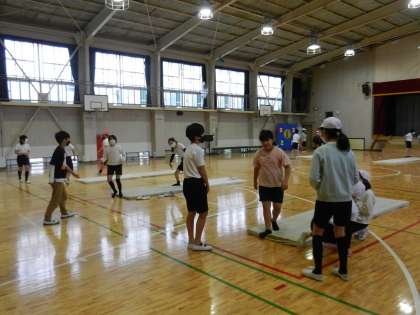 器械運動の「マット運動」に取り組んでいます。開脚後転の練習中です!