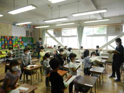 音読を楽しみます。声の大きさに気を付けます。