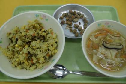 ☆今日の献立 高菜チャーハン ワンタンスープ 豆黒糖 牛乳