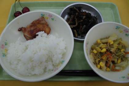 6月10日(金)の給食 公開日 2022/06/10 更新日 2022/06/10 今日の給食 ☆今日の献立 ごはん とりのレモン醤油 ひじきの炒め煮 カリカリじゃこのサラダ さくらんぼ 牛乳 いいね(0)