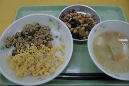 ☆今日の献立 二色丼 豆腐とじゃがいものみそ汁 五目煮豆 牛乳