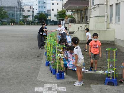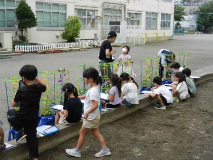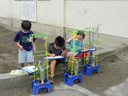 1年生はあさがおの観察です。きれいな花がたくさん咲きました。