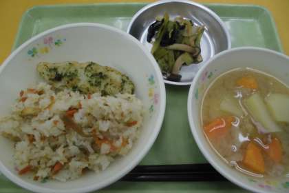☆今日の献立 にんじんごはん 桑都揚げ 田舎汁 小松菜と油揚げの煮浸し 牛乳
