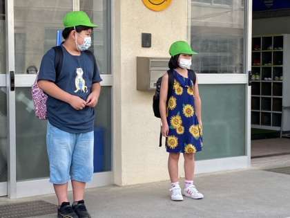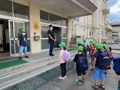 保護者の方々、教職員も子供たちを迎えます。