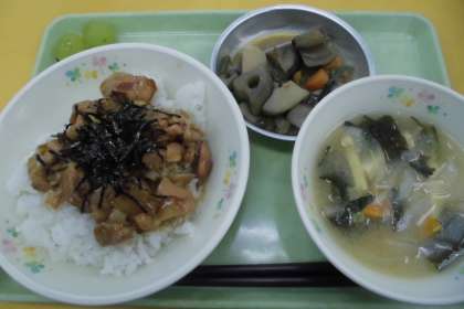 ☆今日の献立 焼き鳥丼 里芋のうま煮 たまねぎのみそ汁 シャインマスカット 牛乳