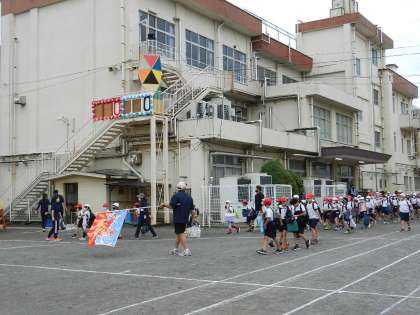 午前8時20分。児童が校庭に移動します。