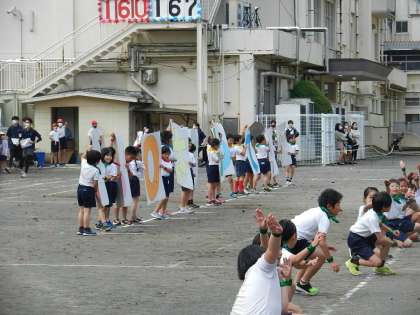 最後は「創立150周年記念運動会」のプラカードを掲げます。
