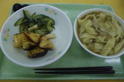 ☆今日の献立 カレー南蛮 大学芋 きゅうりといかのスイング 巨峰 牛乳