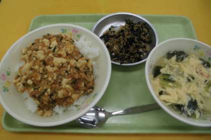 ☆今日の献立 ごはん マーボー豆腐 たまごスープ わかめとじゃこのさっと煮 牛乳