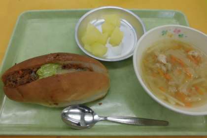 ☆今日の献立 タコスドック 野菜のスープ りんご缶 牛乳