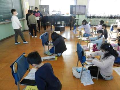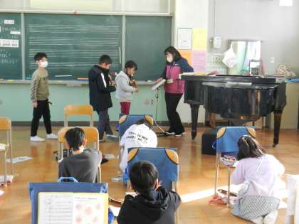 音楽担当の先生が一人一人、リコーダーの演奏を確認します。緊張!