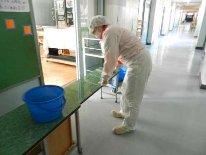 校舎内を給食調理員さんが回ります。