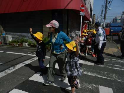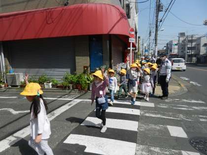通学路を歩きながら、横断歩道の渡り方を実践します。
