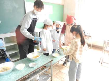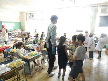 担任の先生と一緒に配膳します。