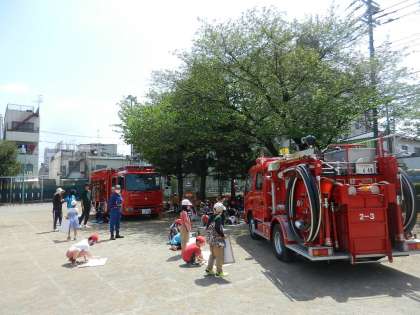 青空の下、真っ赤な消防自動車が鮮やかです。