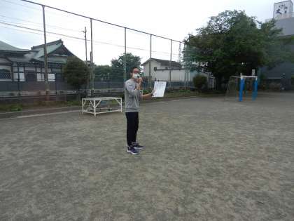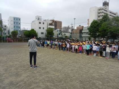 学校長の話に続いて、週番の先生が「今月の生活目標」について伝えます。