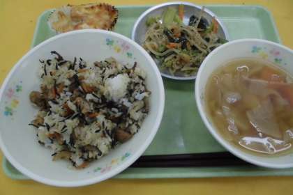 ☆今日の献立 ひじきごはん 厚揚げのチーズ田楽 根菜汁 ごま和え 牛乳