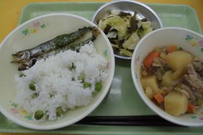 ☆今日の献立 グリンピースご飯 ししやもの磯辺焼き 肉じゃが キャベツのピリ辛炒め 牛乳