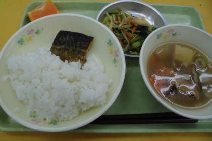☆今日の献立 ごはん さばのカレー焼き のっぺい汁 小松菜の煮浸し オレンジ 牛乳