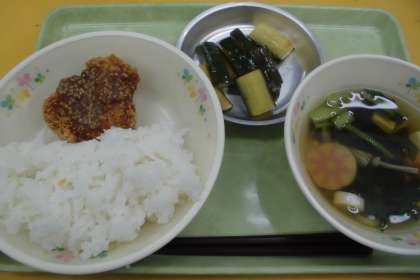 今日の献立 味噌チキンカツ丼 スタミナきゅうり 青菜と豆腐のすまし汁 牛乳