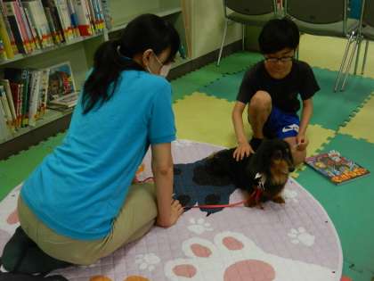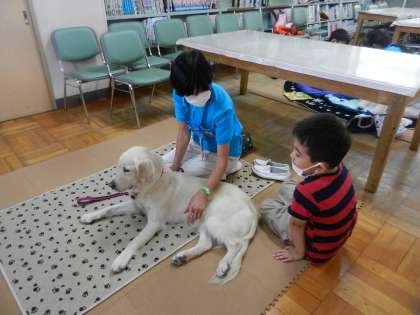 こだま学級の子供たちが「読書犬」とのふれあい活動の真っ最中です。