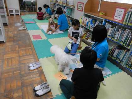読書犬活動とは、読書犬としての適性のある犬と子供が一対になり、子供が人の評価を受けない環境で、犬を相手に本を読み聞かせる活動です。