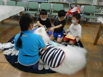 こだま学級の子供たちは自分の好きな本を読書犬に読み聞かせます。
